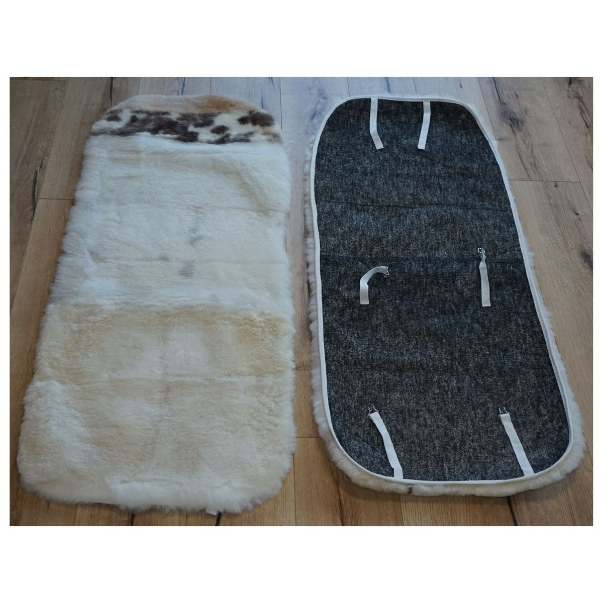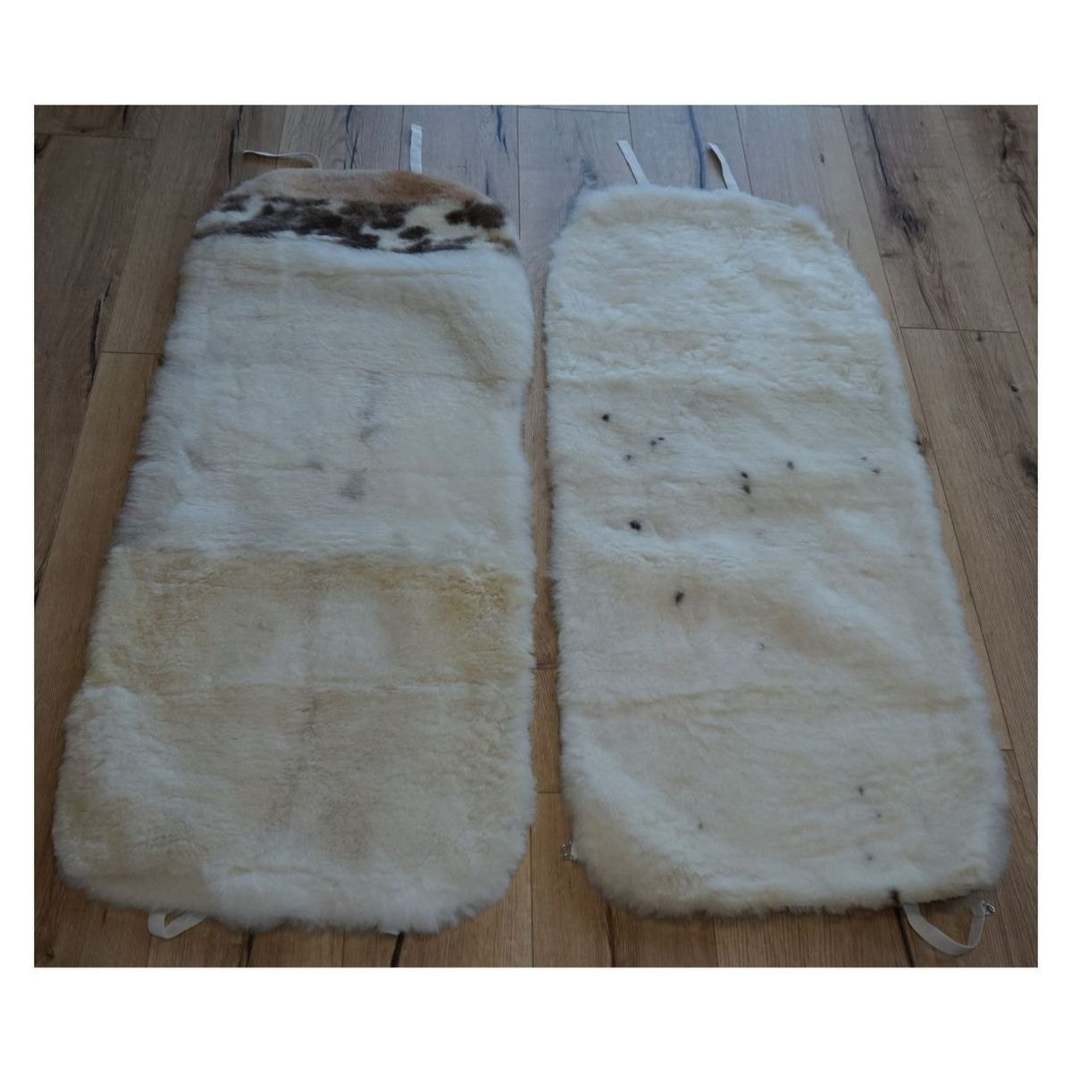 Prevleka je sešita iz ovčje kože. Na hrbtnem delu, so elstični trakci z zatiči.